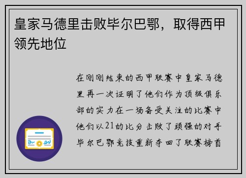 在刚刚结束的西甲联赛中,皇家马德里再一次证明了他们作为顶级俱乐部的实力。在一场备受关注的比赛中,他们以2-1的比分击败了顽强的对手毕尔巴鄂竞技,重新夺回了联赛榜首的位置。这场比赛不仅仅是一场胜利,更是皇马重振旗鼓、向世人展示其王者风范的重要标志。