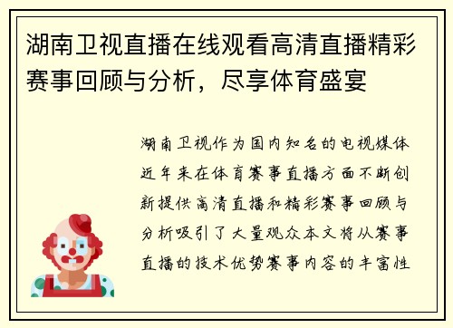 湖南卫视直播在线观看高清直播精彩赛事回顾与分析,尽享体育盛宴